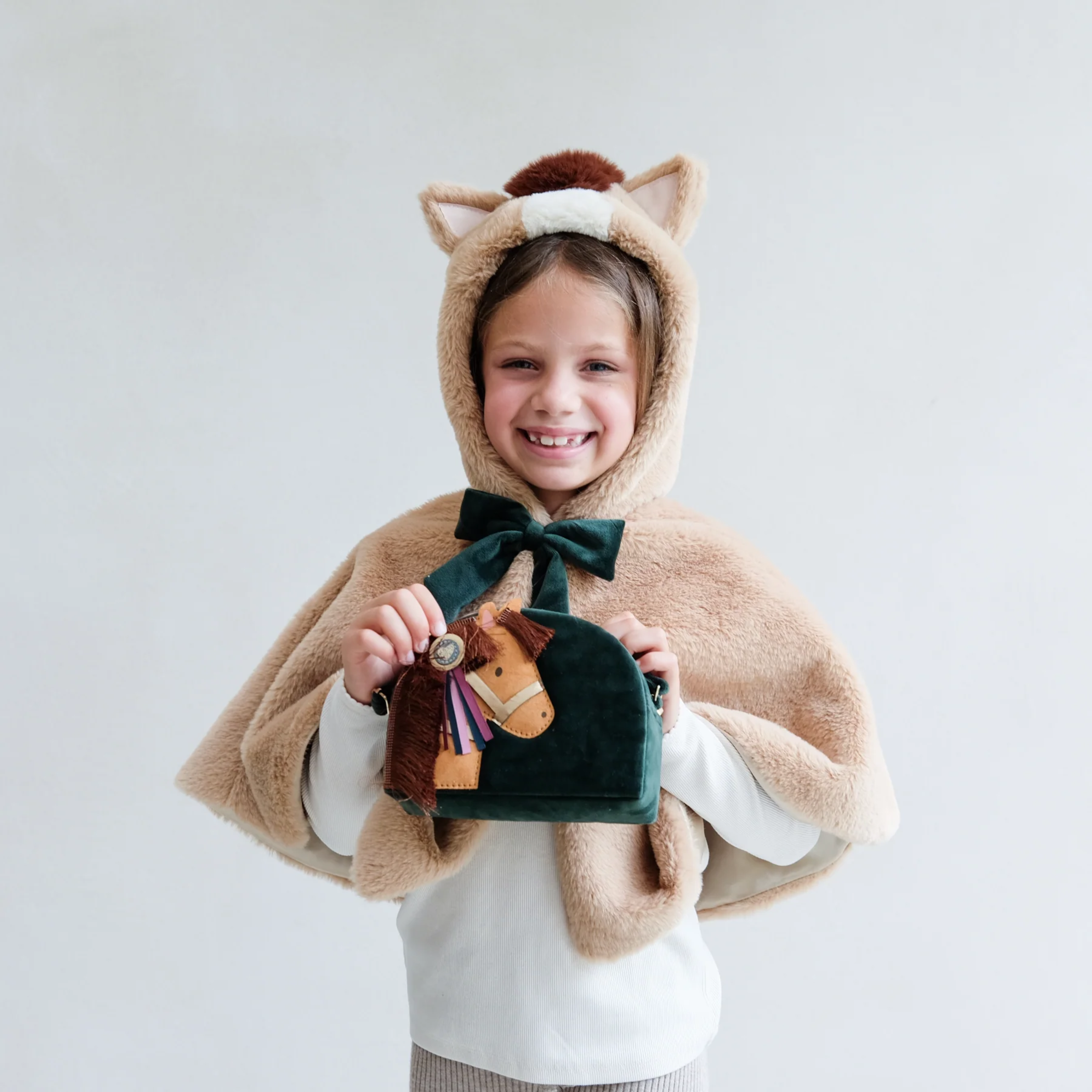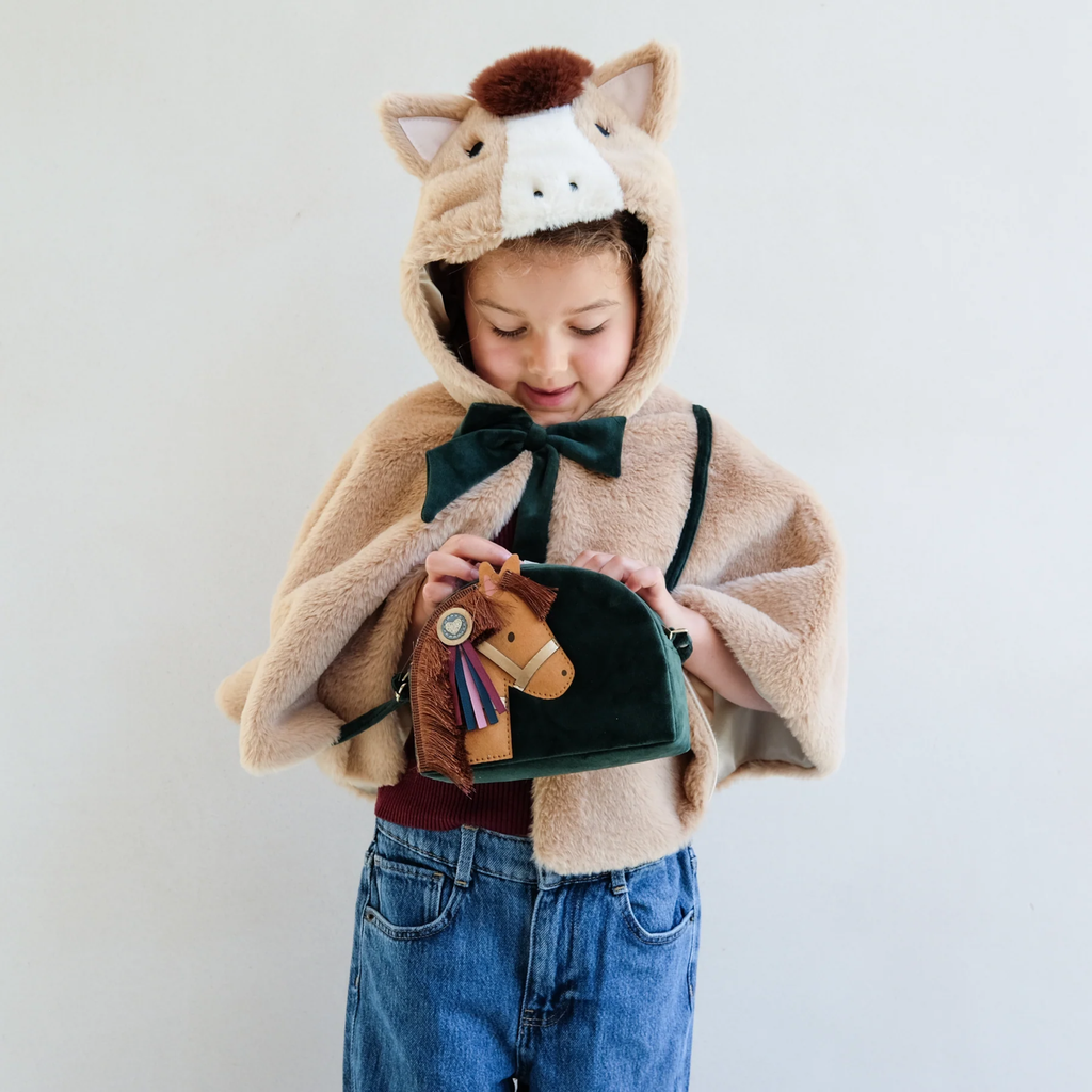 - Crafted from soft dark green velvet with the sweetest pony design featuring a gold head collar and fringe mane complete with a grosgrain ribbon rosette
