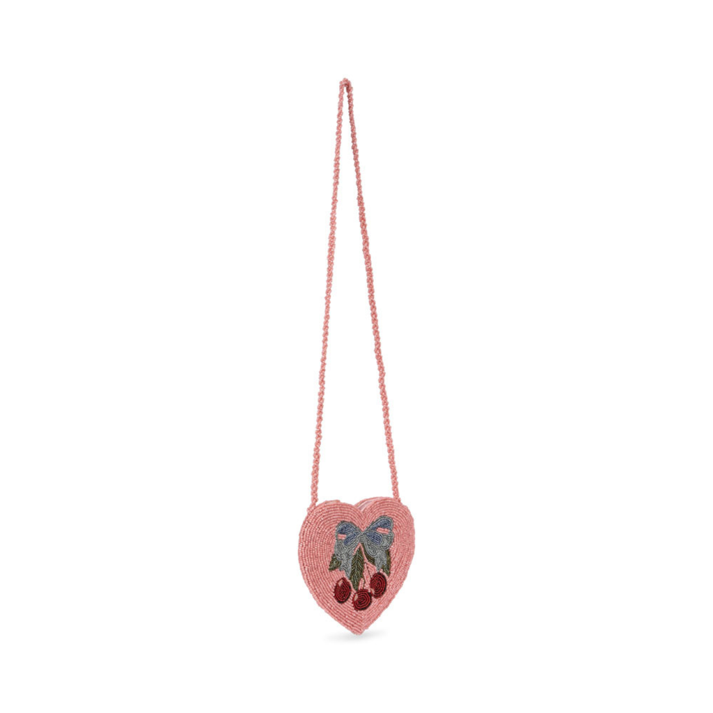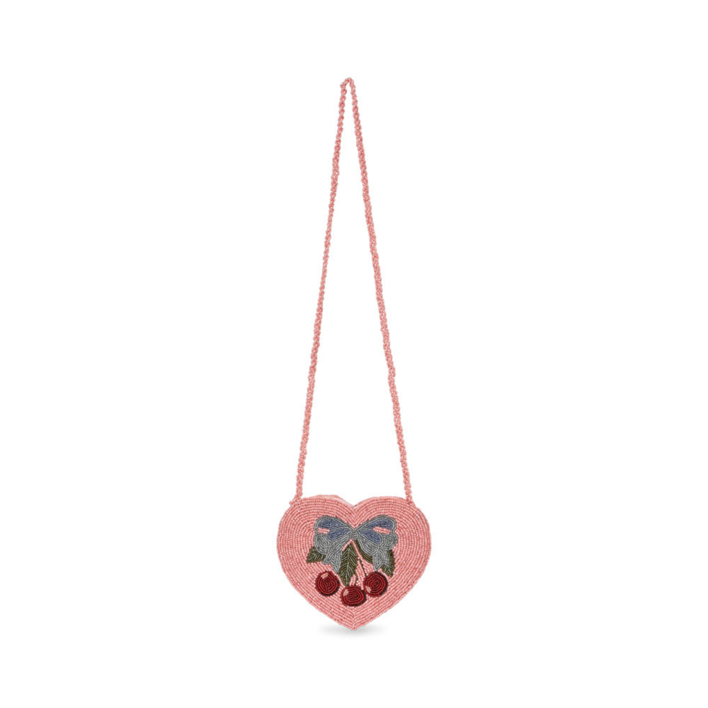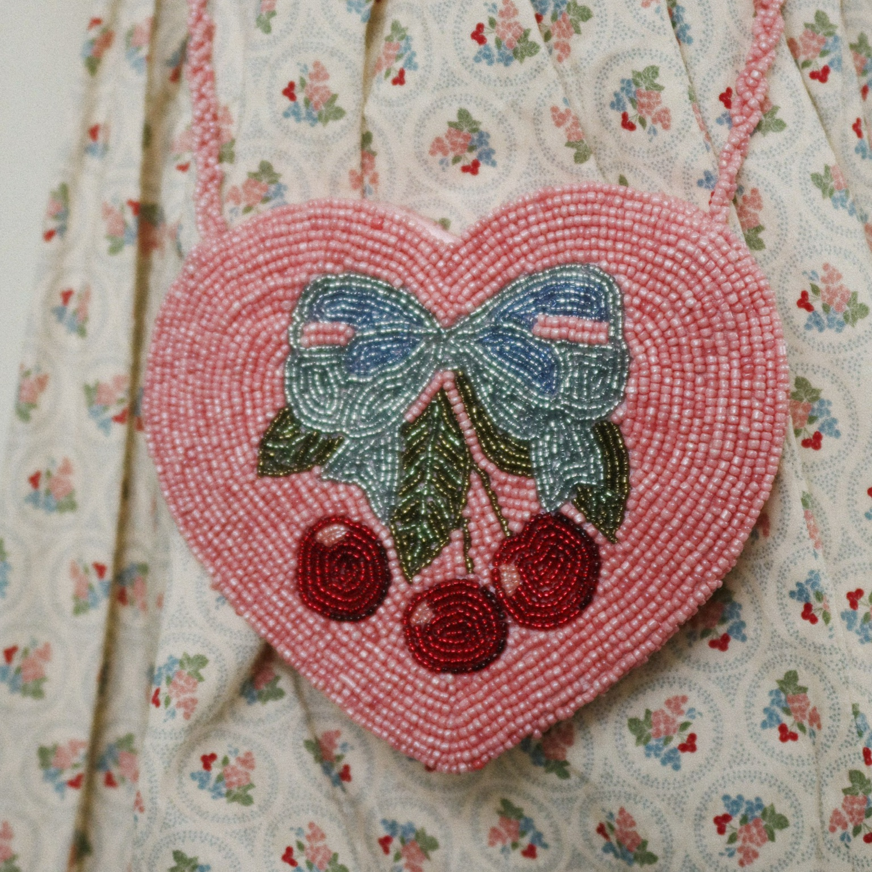 Sweet little heart-shaped shoulder bag adorned with beads that are attached by hand. Each piece is handmade and unique.