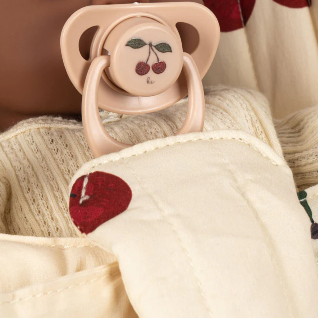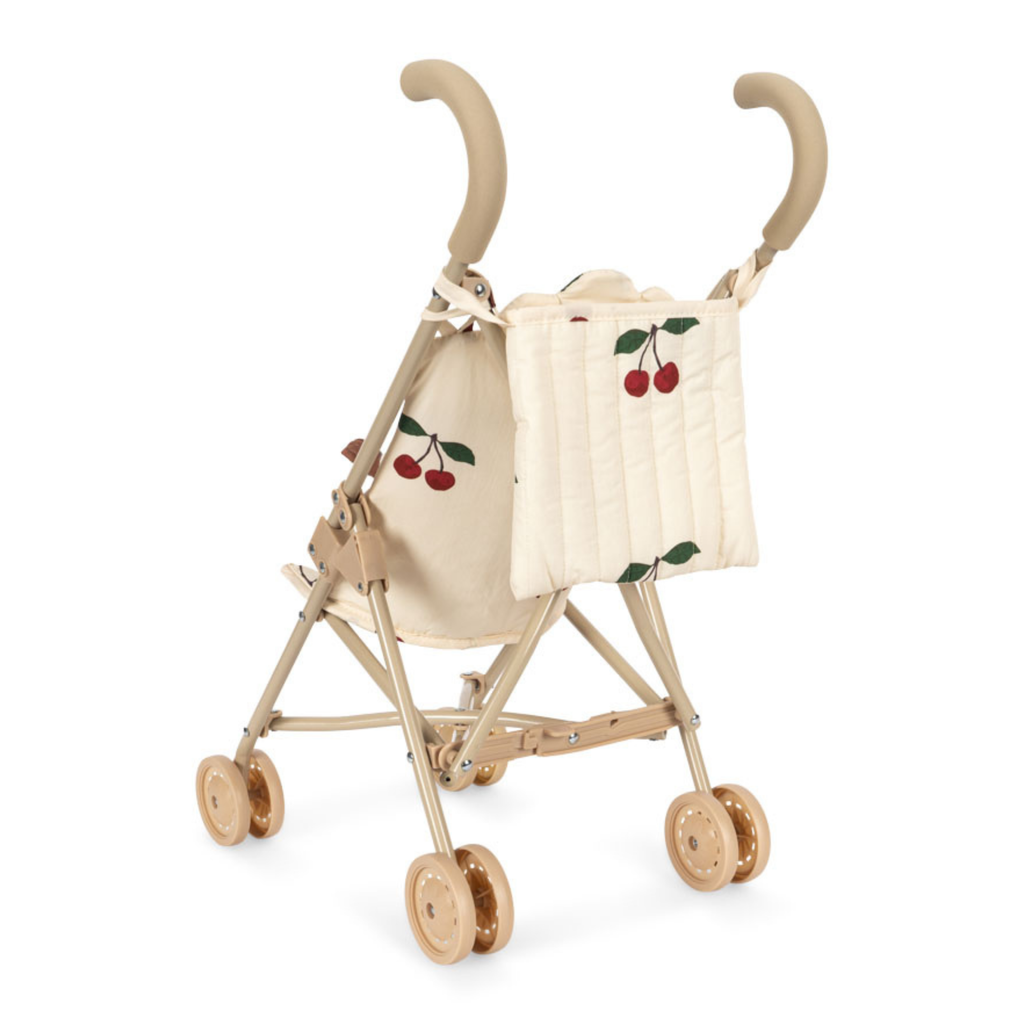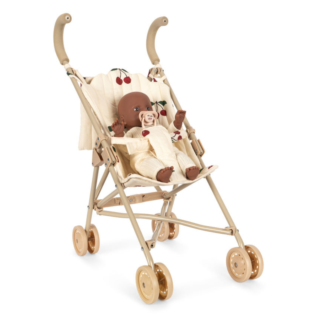 The perfect gift set for little ones: The Cherie doll stroller set includes both a doll and a stroller in Konges Sløjds classic cherry print. The stroller is designed with a harness, carriage bag, and double wheels on all four legs for extra stability. Features removable fabric. Comes fully assembled and is easy to fold and store.
