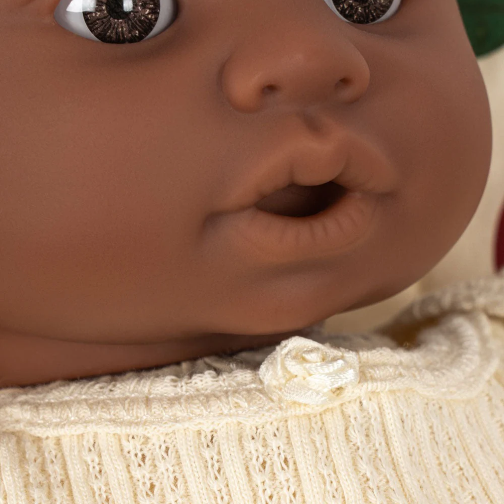 Doll is made in vinyl with 100% cotton fabric and recycled polyester filling and clothing 100% organic cotton. Pacifier: PP