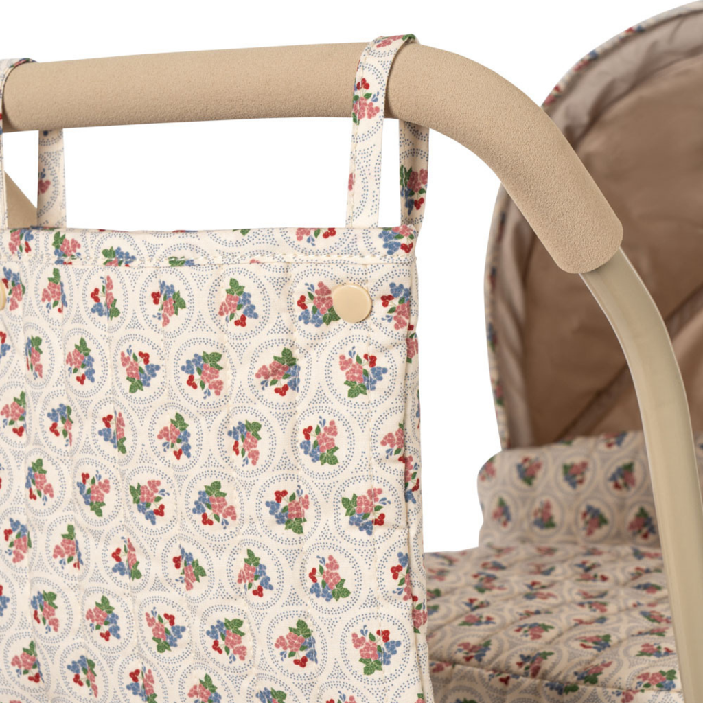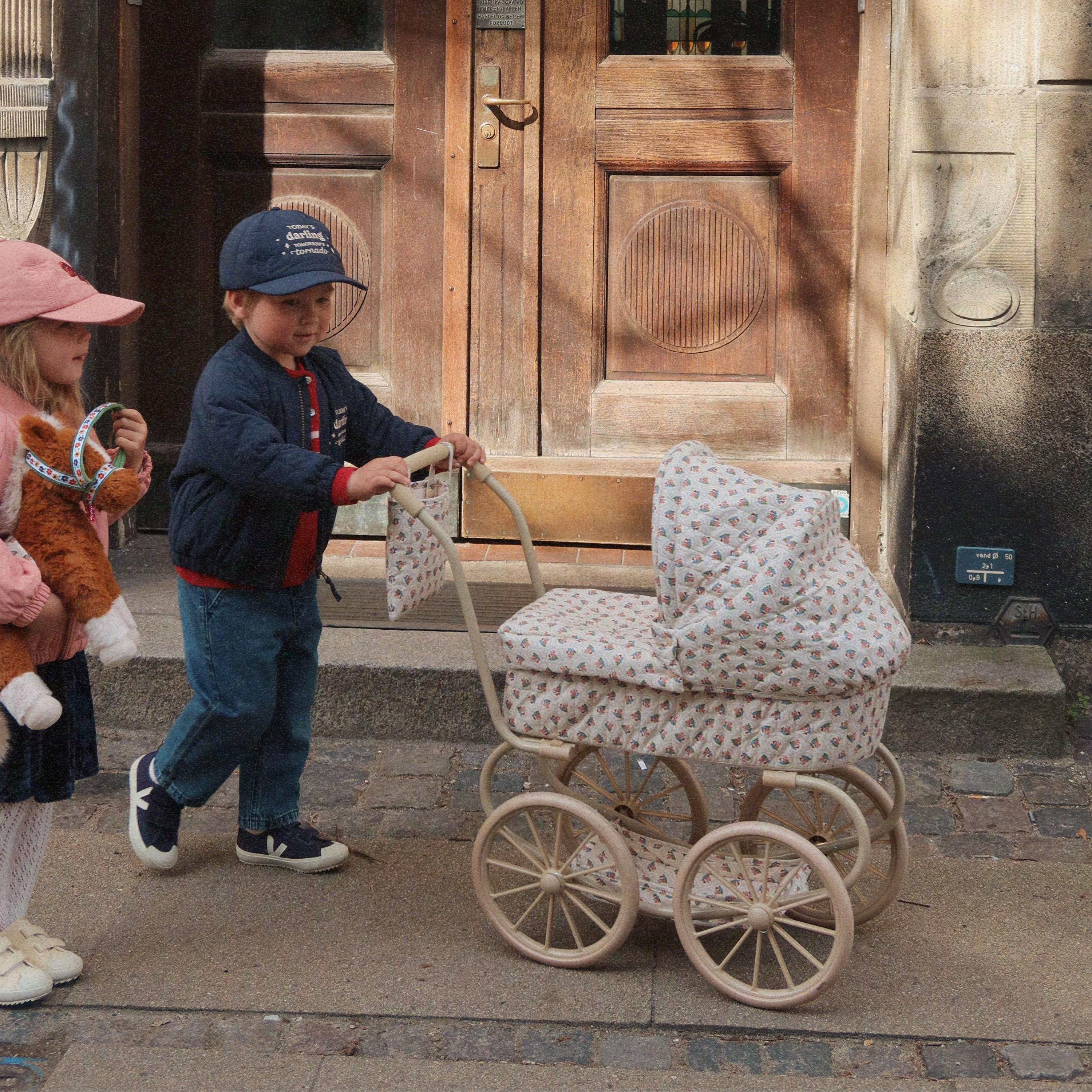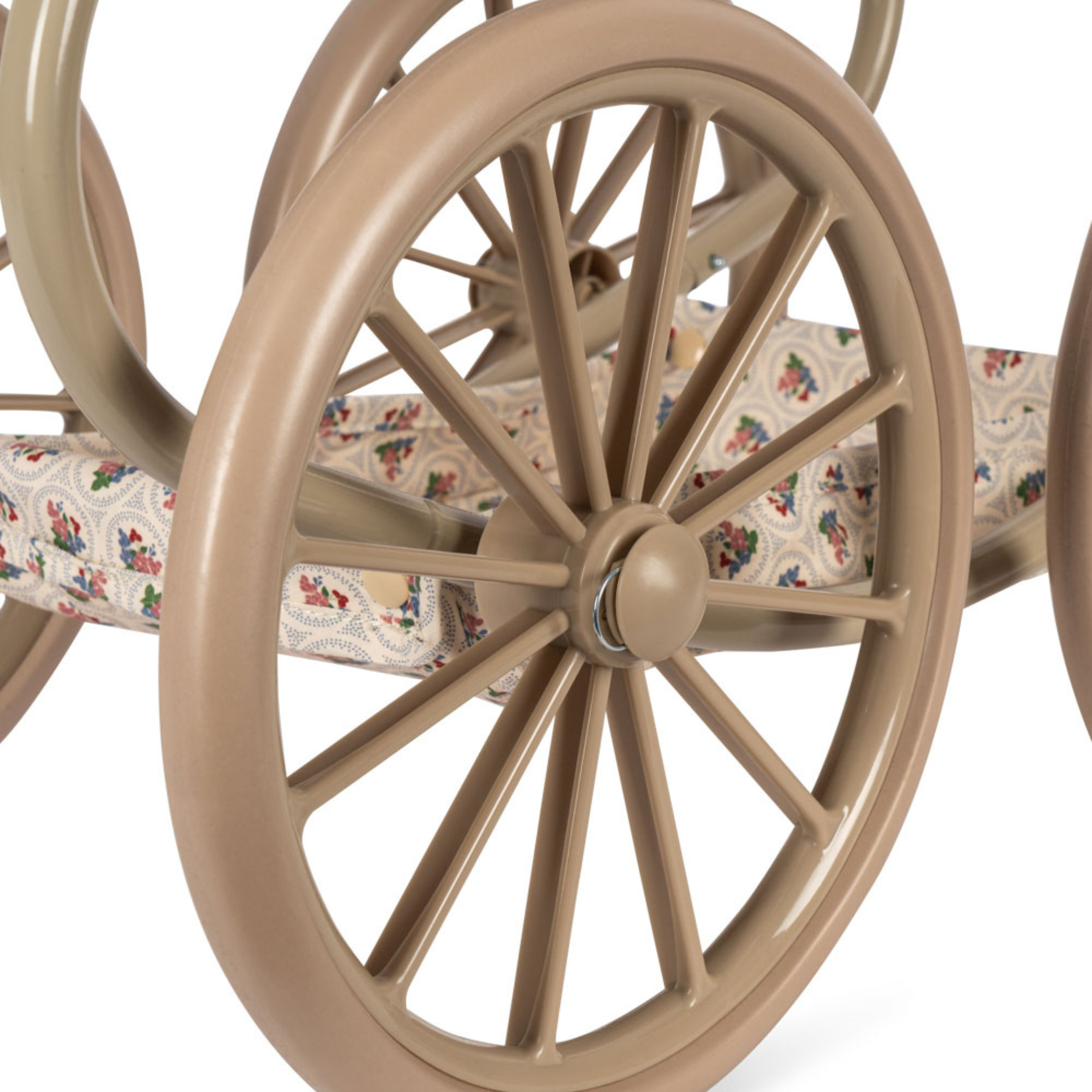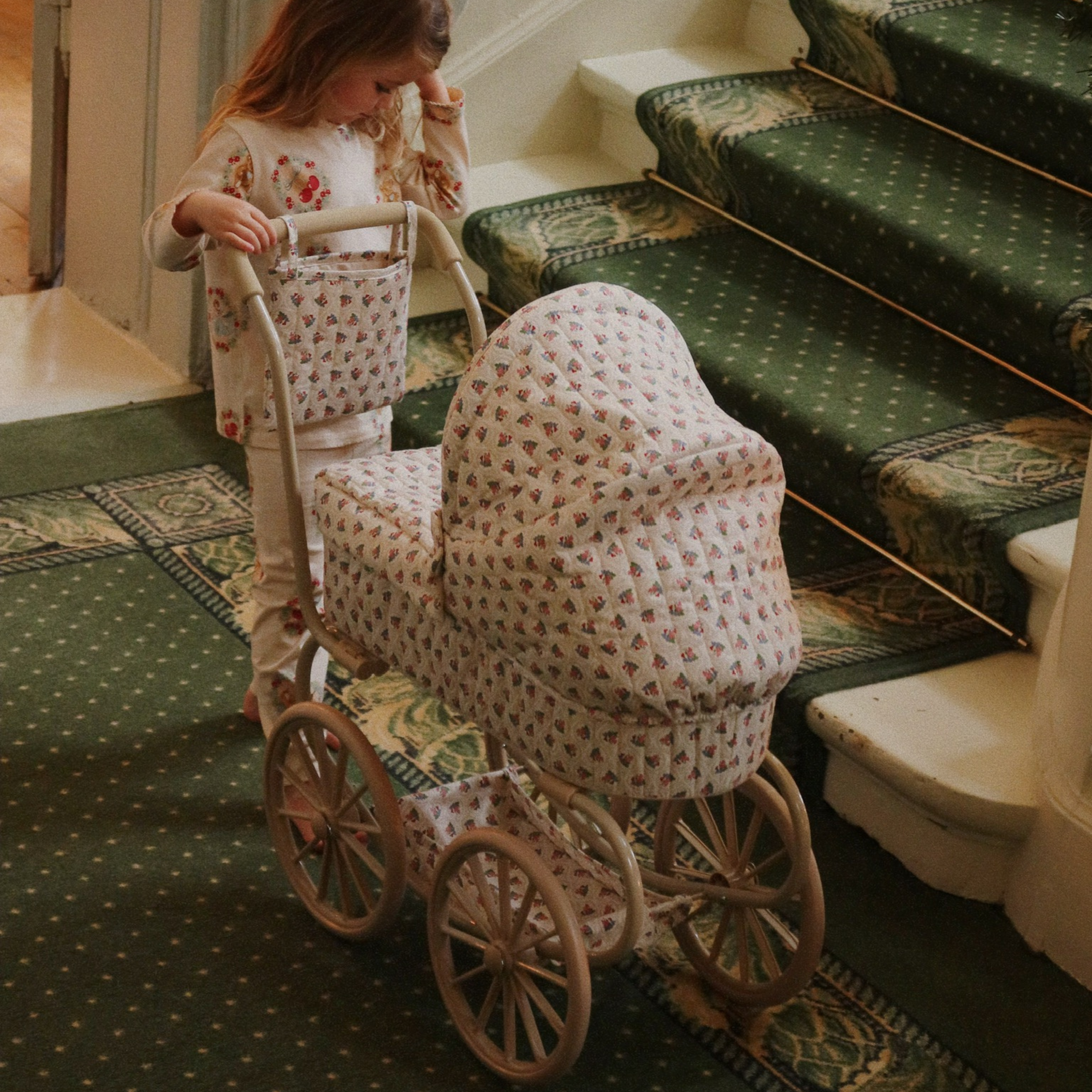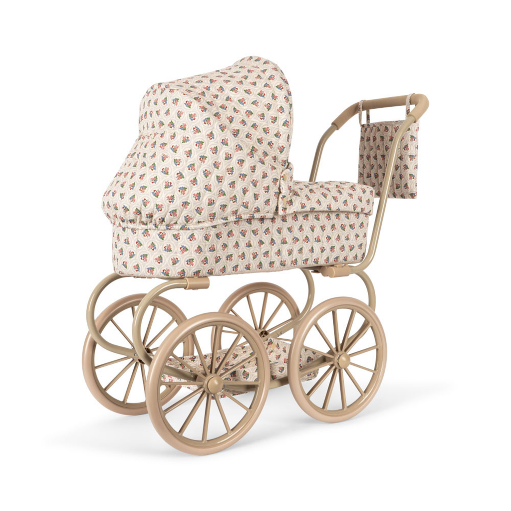 The vintage style doll pram in a smaller version that is easy for little doll parents to maneuver. Designed with four large wheels that make it easy and stable to walk with, quilted fabric, and delicate scallop edges. The doll pram includes a soft mattress and a cushioned storage basket under the lift. The frame is made of metal with spongy soft handles. Comes fully assembled and is easy to fold and store.