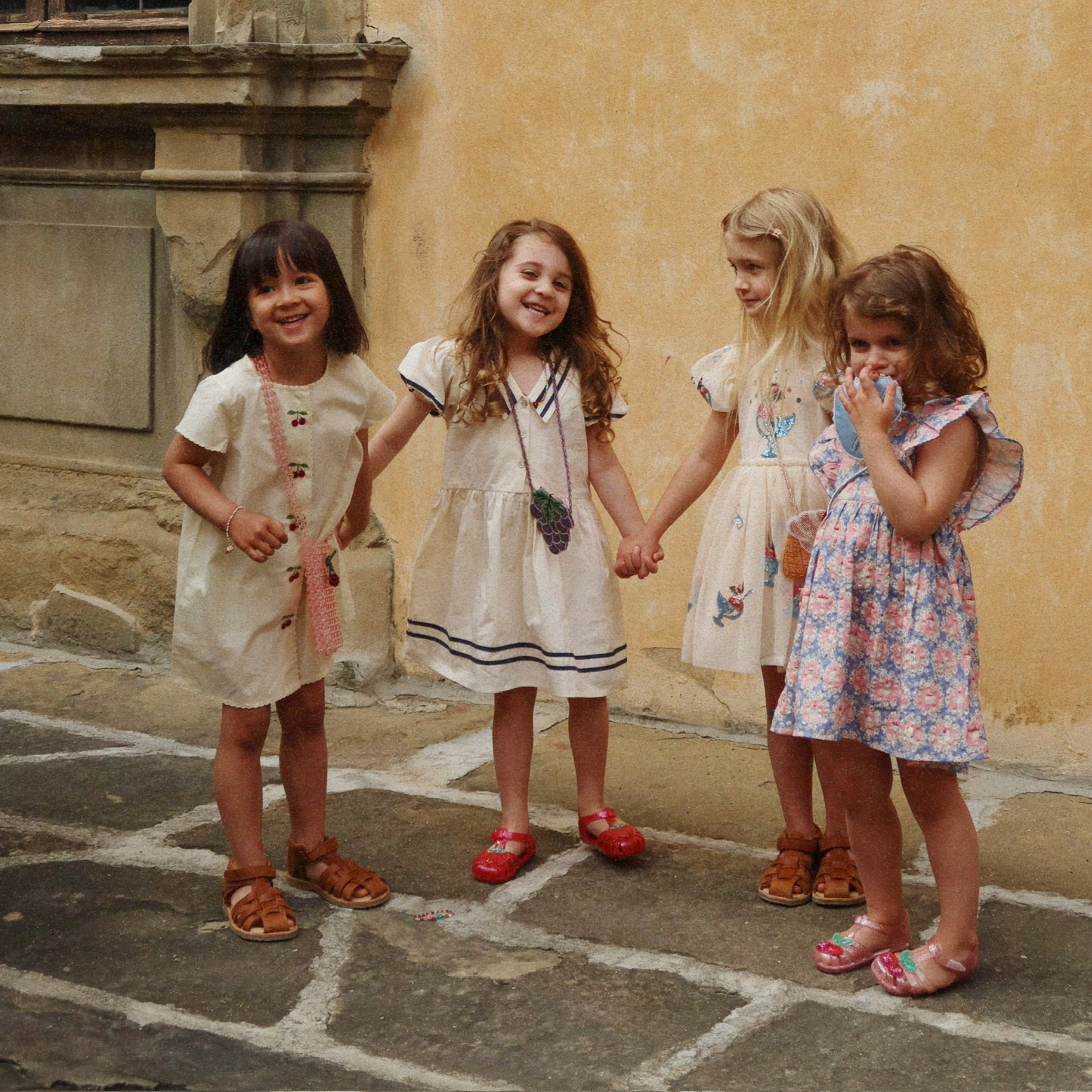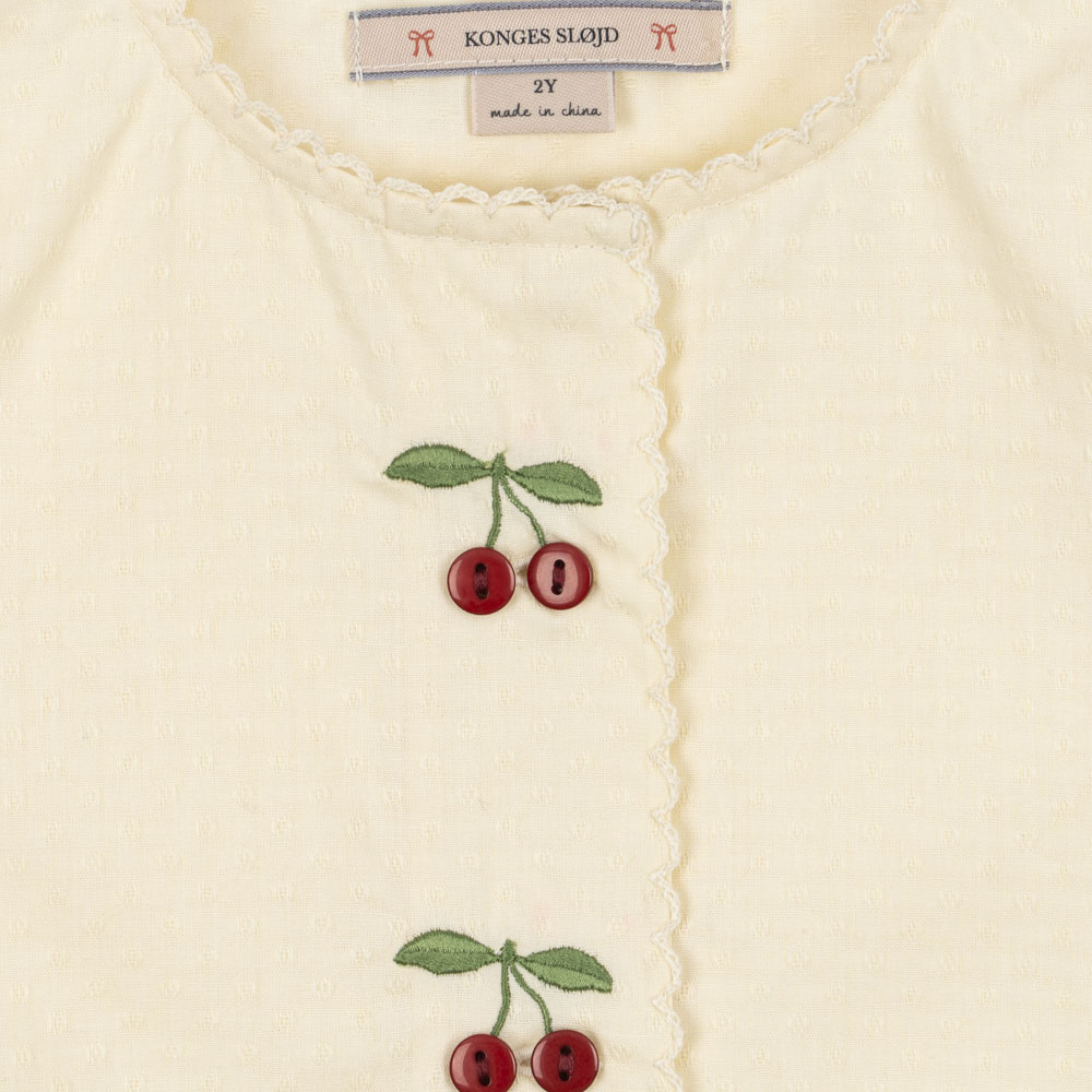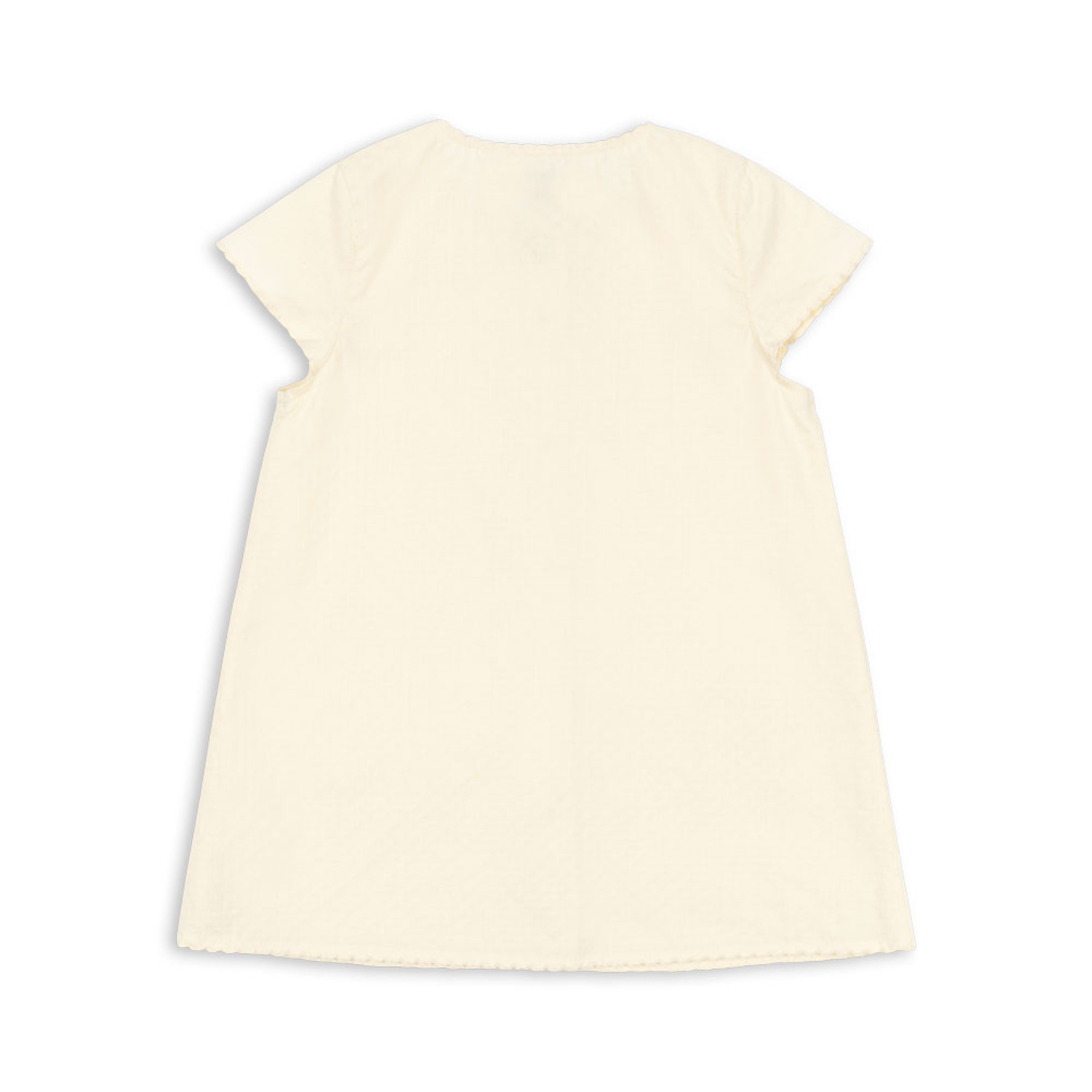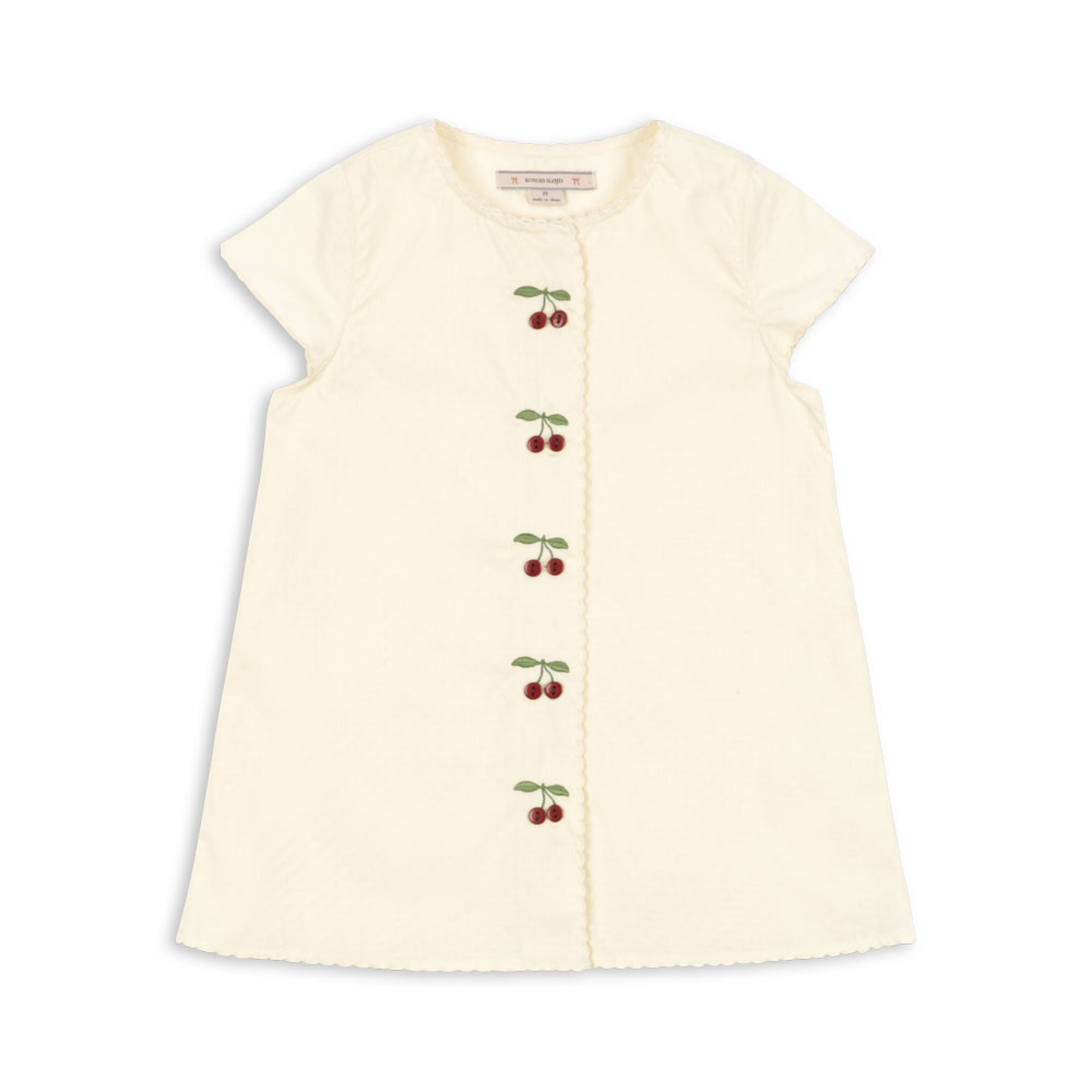 Soft summer dress made from 100% organic cotton. The Evia Cherry Dress is designed in an easy, straight silhouette with short sleeves and eyelet detailing along the hems, and finished with playful embroidery and buttons shaped like little cherries in front.