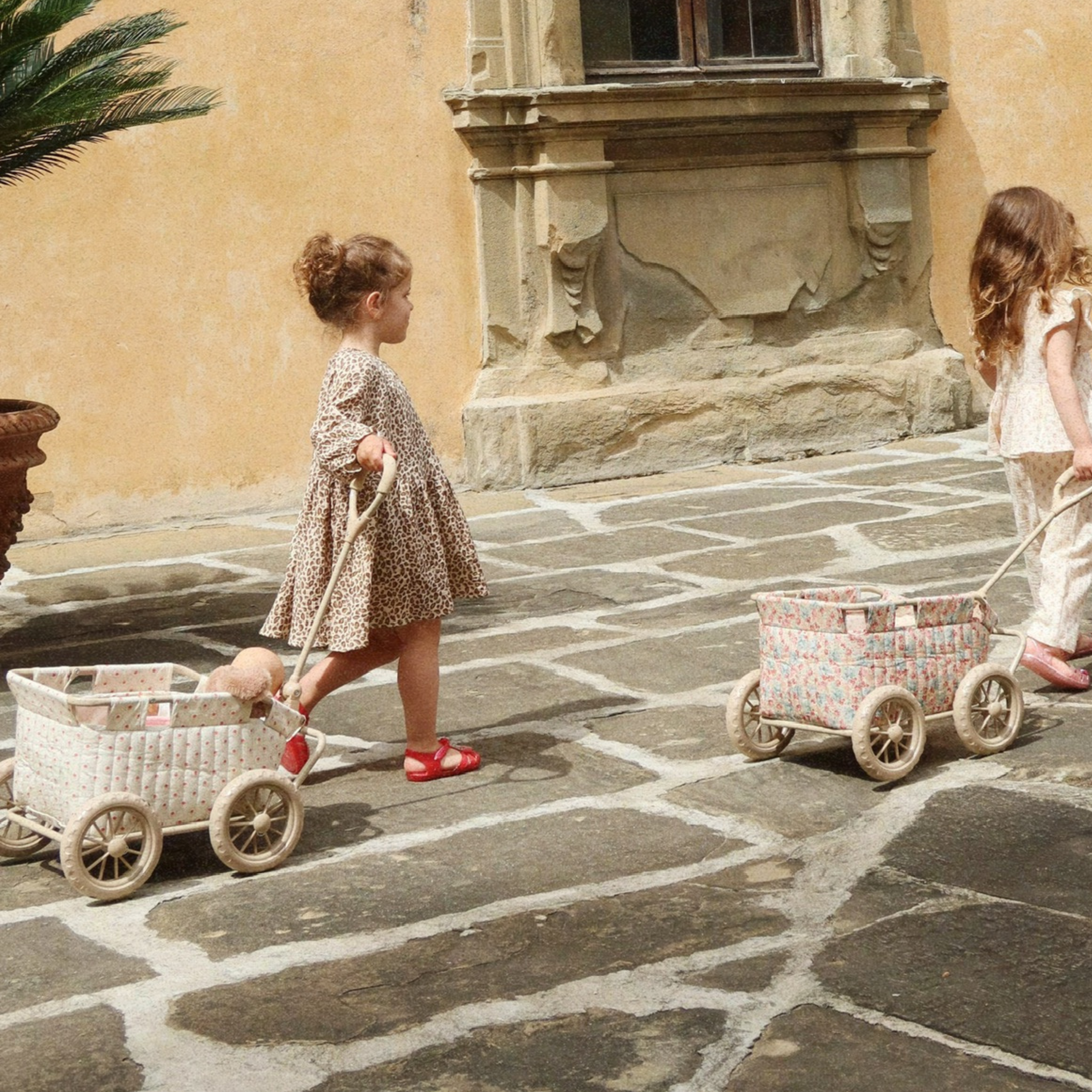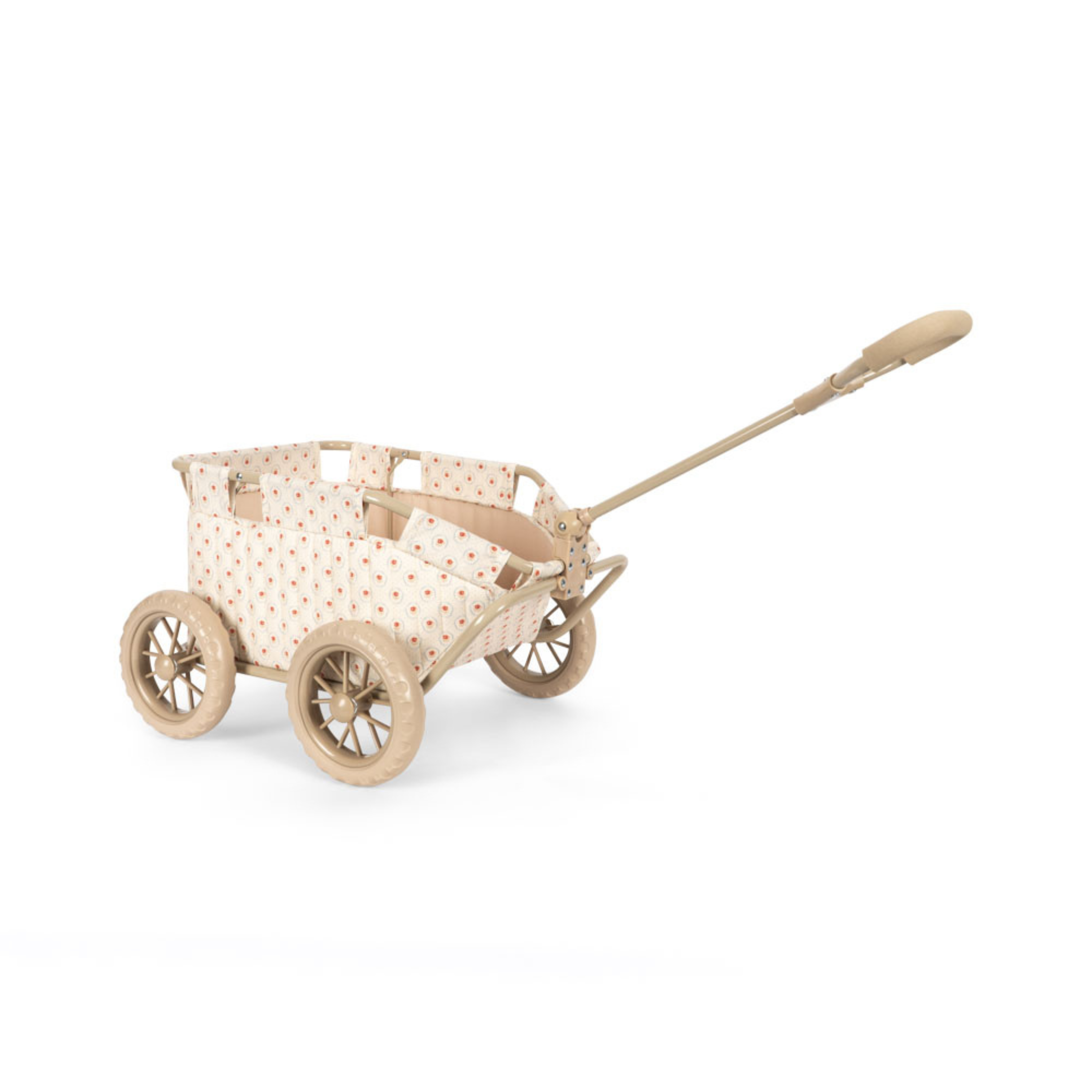 Here's the perfect companion to take all your besties with you for a ride. Our Kids' stroller wagon is designed with a sturdy metal frame and lined with soft cotton. Features smooth, easy-glide wheels and a handle that is sized just right for little hands. Pack all your best dolls and teddy bears and take them with your wherever you go! To keep clean, wipe with dry or damp cloth.