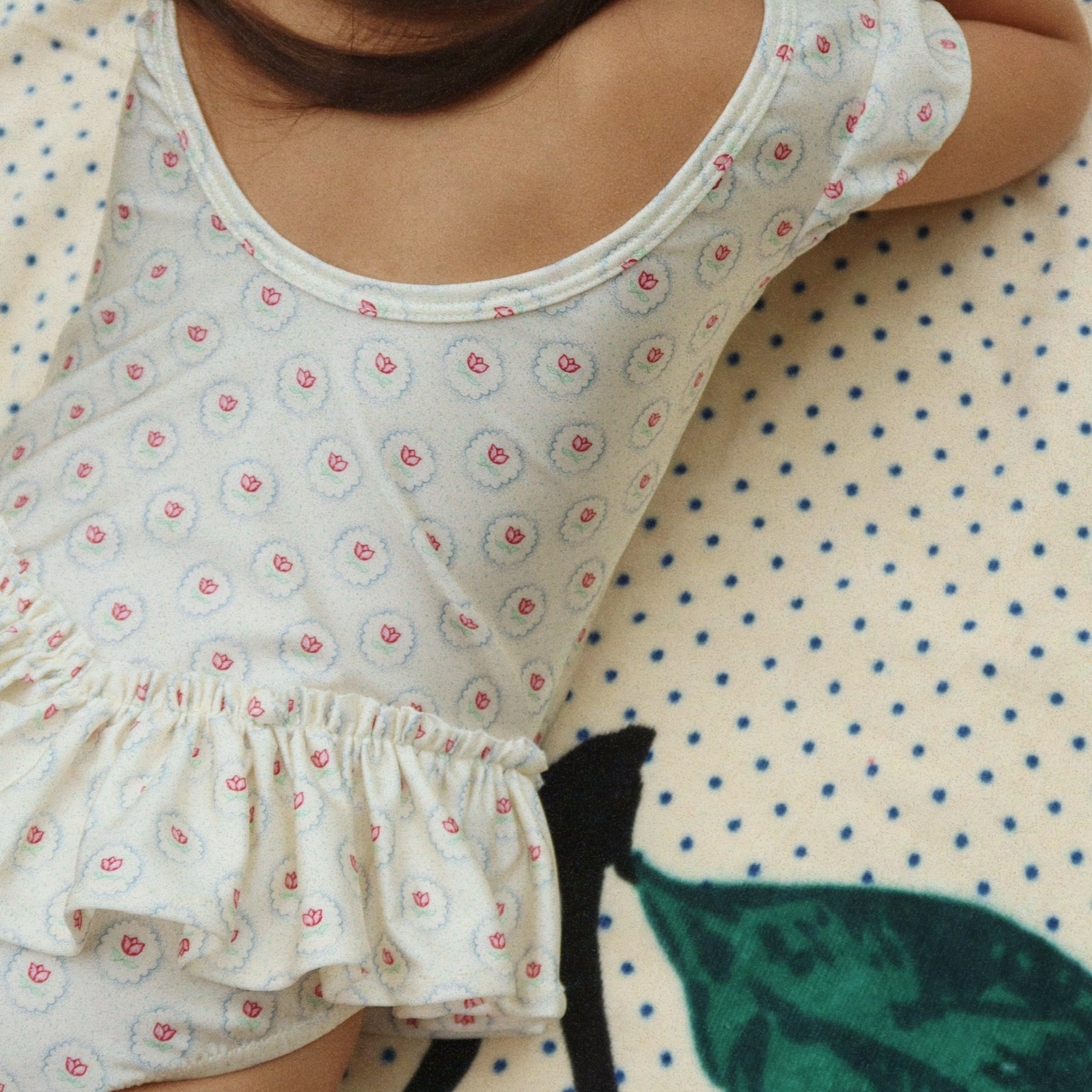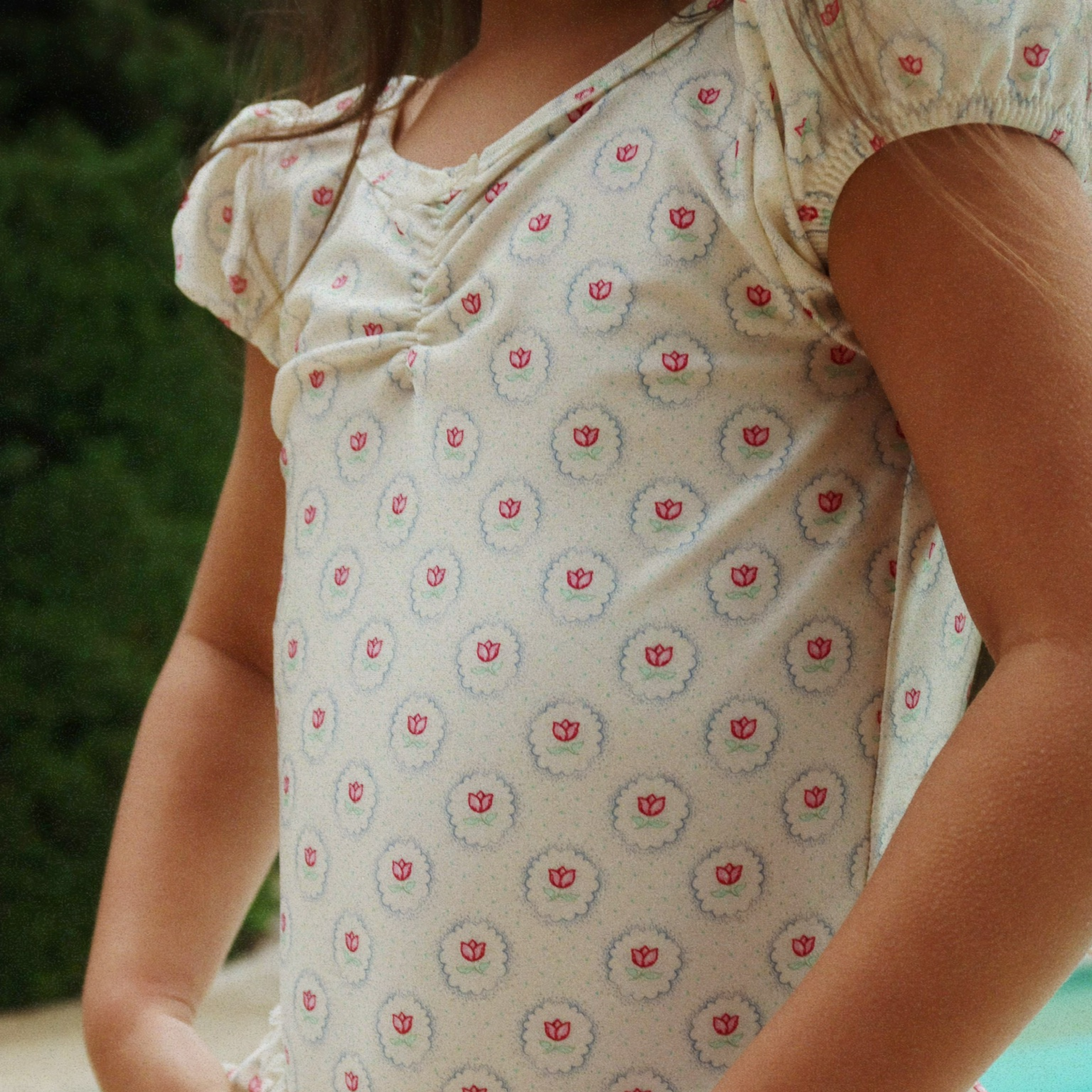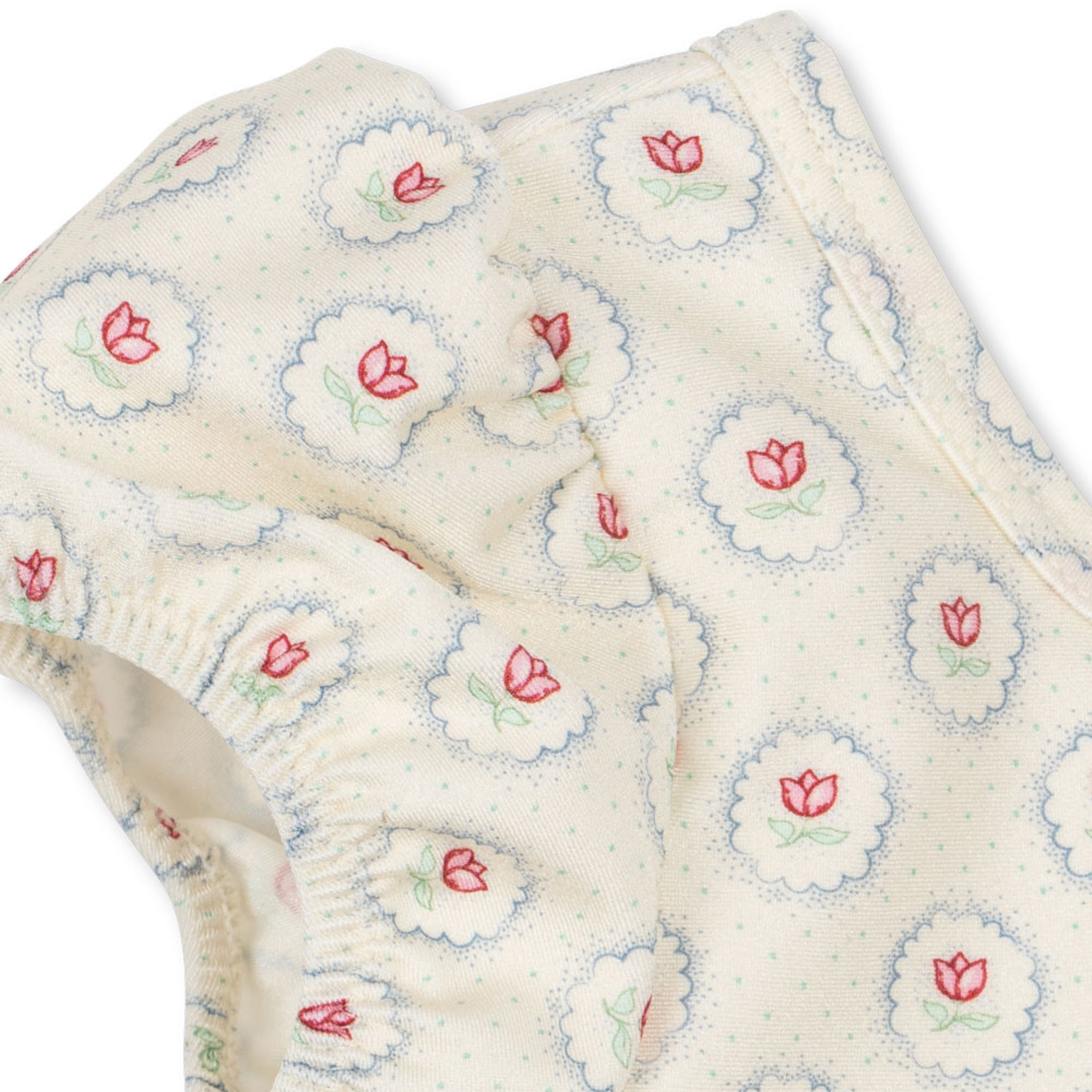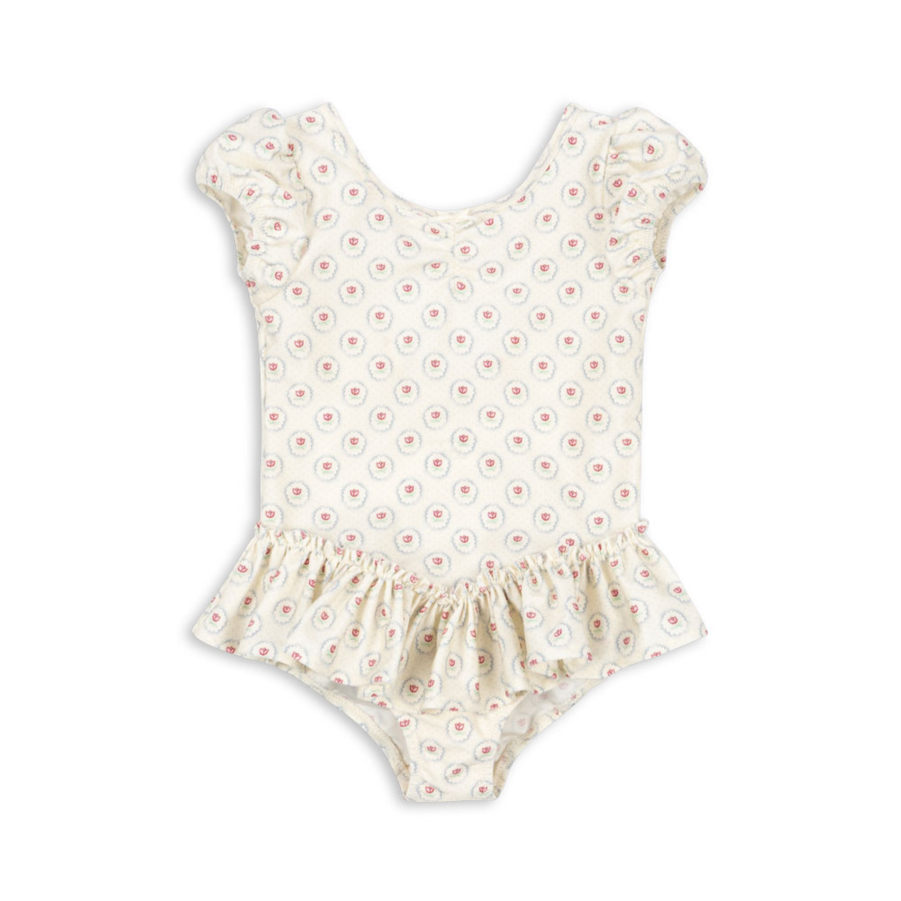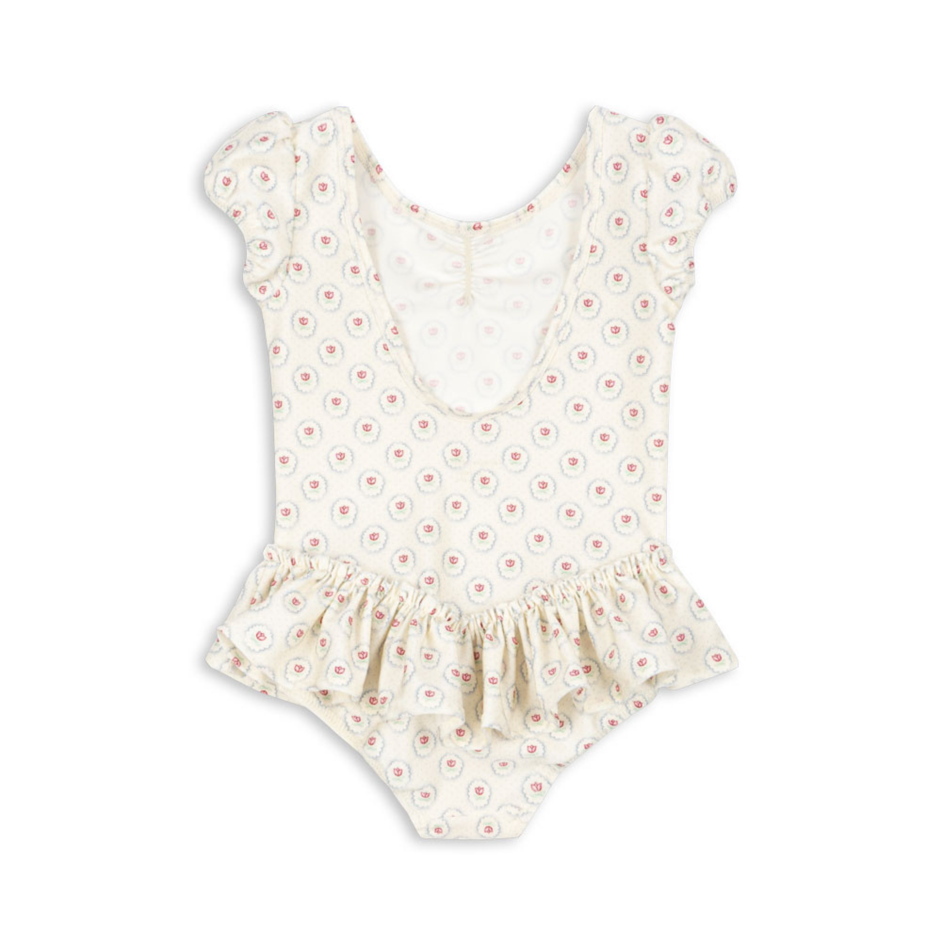 Soft swimsuit crafted from stretchy and quick-drying blend of recycled polyamide and elastane. Designed in a classic silhouette with short puff sleeves, a low scoop back, and frill detailing at leg openings.