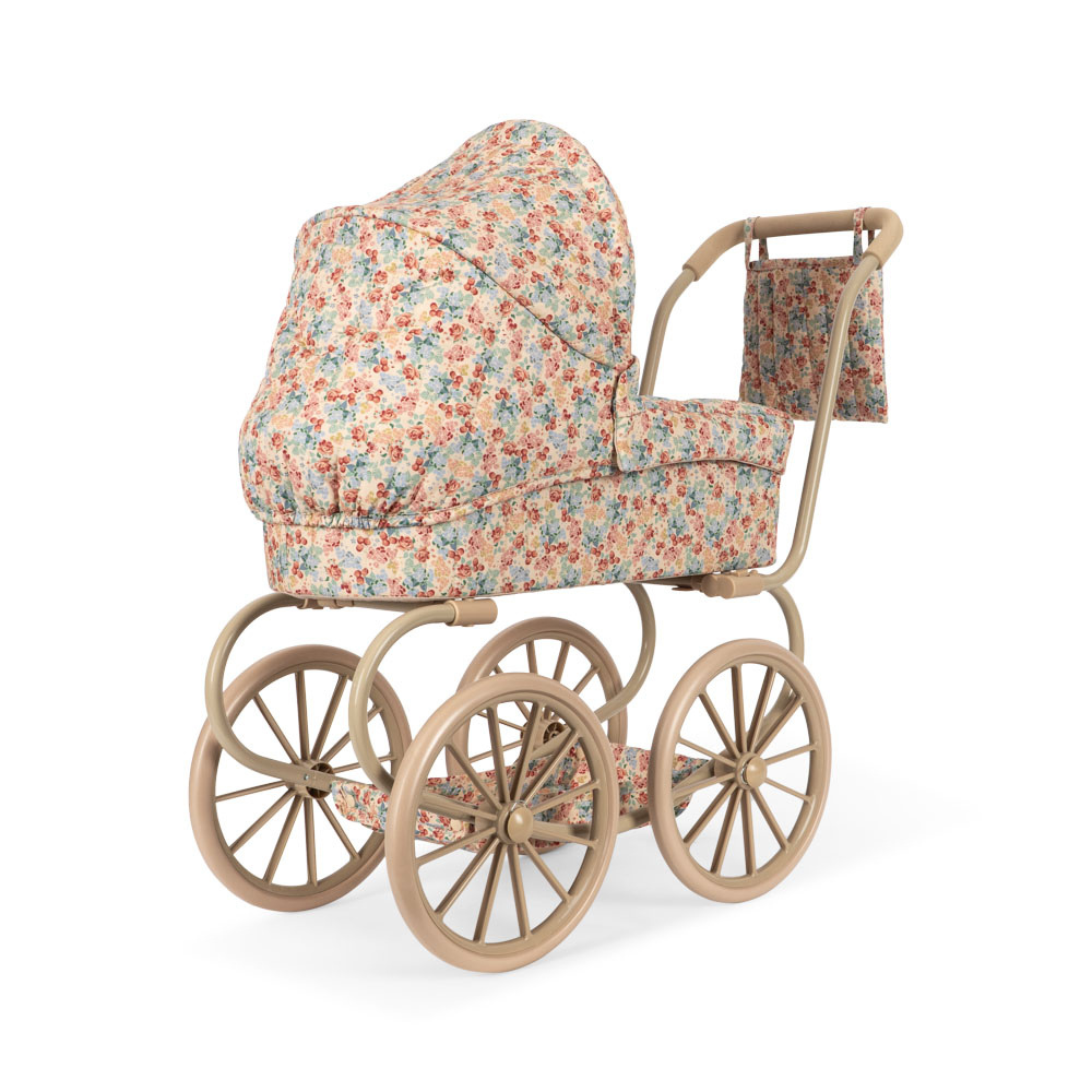 The vintage style doll pram in a smaller version that is easy for little doll parents to maneuver. Designed with four large wheels that make it easy and stable to walk with, quilted fabric, and delicate scallop edges. The doll pram includes a soft mattress and a cushioned storage basket under the lift. The frame is made of metal with spongy soft handles. Comes fully assembled and is easy to fold and store.